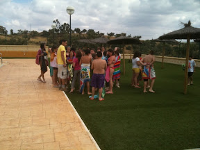 Acaban de estar en la piscina. Se han cambiado, y van a hacer unos talleres: cuero, tiro con arco y juegos de agua.